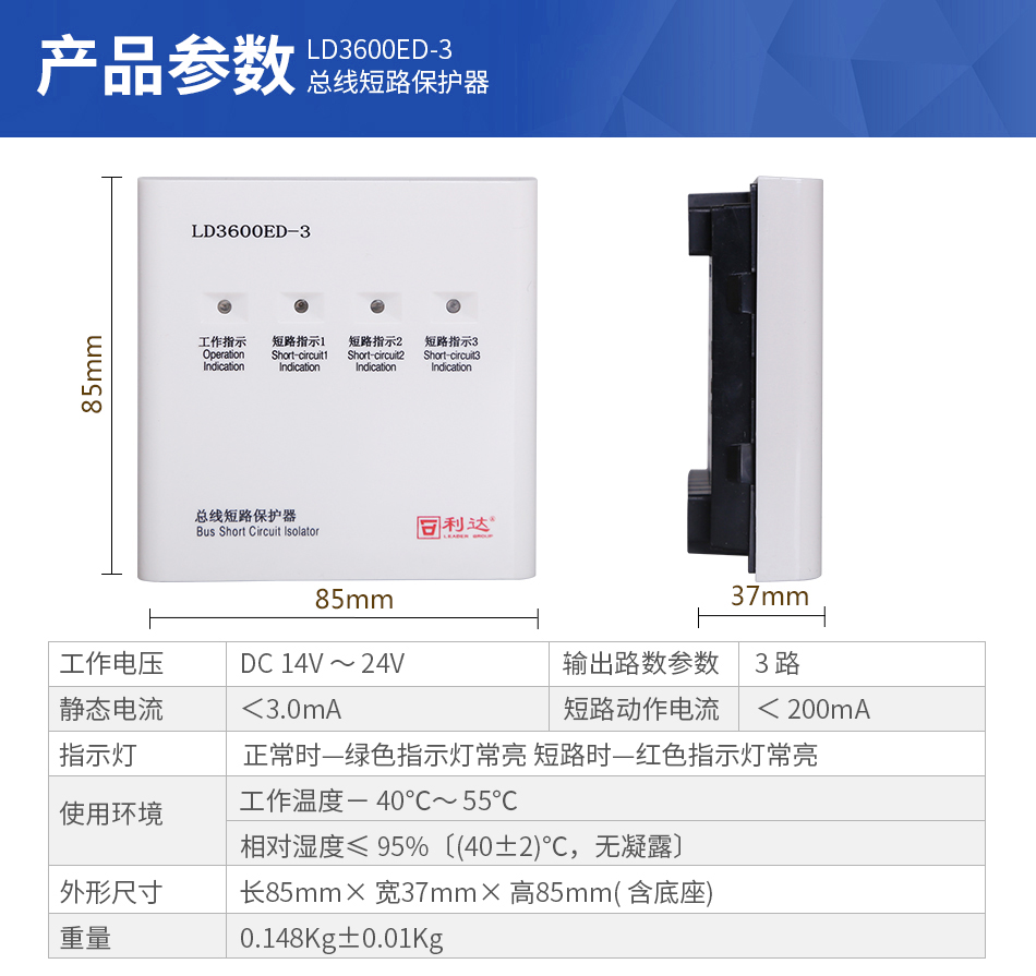 LD3600ED-3主要用于火災報警控制器的二總線回路中,隔離線路中的短路點,保證線路中的其他設備的正常運行。可以與利達公司生產的E/EN/EL系列火災報警控制器配合使用。本產品無污染、功耗低,適用于各種工業及民用建筑。LD3600ED-3輸出為3路,各路獨立保護,不相互影響。